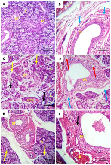 (A,B) Hematoxylin and eosin (H&E) staining in submandibular salivary glands of the control group displaying normal structures. Serous acini (S), granular convoluted tubule (GCT), striated duct (ST), and excretory duct (EX) surrounded by fibrous connective tissue stroma (blue arrows). (C,D) Hematoxylin and eosin (H&E) staining in the AgNPs group showing degenerated acini (red arrows), atrophic serous acini (S) with cytoplasmic vacuolation (black arrows), and wide interacinar spaces (yellow arrows). Vacuolated GCT and striated duct (ST) and excretory duct (EX) with thickened lining epithelium presenting extensive vacuolations (red arrows). Degeneration in the surrounding connective tissue (blue arrows). (E,F): Hematoxylin and eosin (H&E) staining in the vitamin E-treated group presenting typical serous acini (S), GCT with few cytoplasmic vacuoles (yellow arrows), and striated ducts with normal cell lining (ST). Dilated and congested blood vessels were observed (B) and the excretory duct (EX) shows relatively normal lining with slight vacuolations in some areas (black arrow) (original magnification ×400).