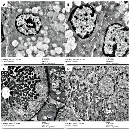An electron micrograph of the submandibular gland from a control group showing: (A): Serous acinus with pyramidal-shaped cells and normal nucleus (Nu) and secretory granules (S), (B): Serous acini with normal cell to cell junction (arrows), normal mitochondria (M), and rough endoplasmic reticulum (R), (C): granular convoluted tubule with normal nucleus (N) and secretory electron-dense granules (G), (D): Striated duct with numerous radially arranged mitochondria (M).