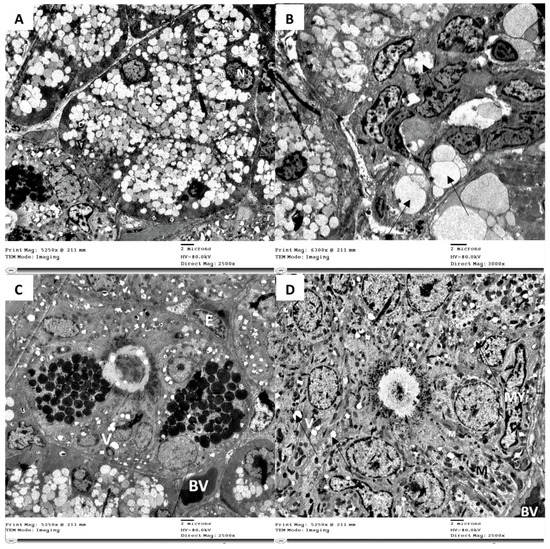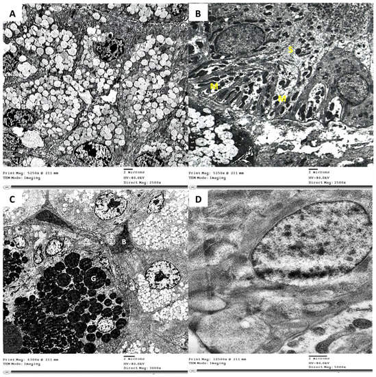 An electron micrograph of the submandibular gland from the vitamin E group showing (A): an almost normal acinus structure with basally located nucleus (N), and myoepithelial cell (M), few vacuolization (arrows) can be observed, (B): striated duct with almost normal basal striations, moderate number of elongated radially arranged mitochondria (M), and electron dense secretory vesicles (S); (C): granular convoluted tubules lined with columnar cells with a lot of electron-dense granules (G). (D): Striated duct with numerous radially arranged mitochondria (M).
