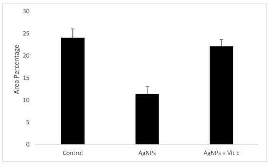 Post Hoc Tukey test comparison between the groups revealed that the difference between the control group and AgNPs + vitamin E group was not significant (p = 0.055). However, a significant decrease was found between the AgNPs and control groups (p = 0.001), and a significant increase was also found between the AgNPs + vitamin E and AgNPs groups (p = 0.001) (Table 1 and Table 2).