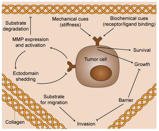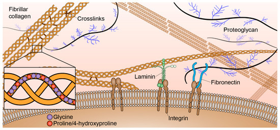 The tumor microenvironment consists of multiple biochemical, mechanical, and structural signals. One of the major structural components of the tumor microenvironment is the extracellular matrix (ECM). The ECM is a very dynamic structure consisting of many components including collagen, laminin, fibronectin, glycoproteins, proteoglycans, and polysaccharides (Figure 1). There have been increasing efforts to better understand the influences of the ECM components on cell behaviors and functions. A major focus of studying the ECM is the role of collagen in both normal and abnormal function. Collagen is the most abundant ECM protein in the human body. There are twenty-eight different types of collagen involved in many normal biological functions such as tissue scaffolding, cell adhesion, cell migration, angiogenesis, tissue morphogenesis, and tissue repair [1]. Based on function and domain homology [2], these collagens are classified into seven groups: fibril-forming (fibrillar) collagens, fibril-associated collagens with interrupted triple helices, network-forming collagens, transmembrane collagens, endostatin-producing collagens, anchoring fibrils, and bead-filament-forming collagens.