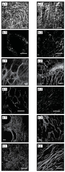 - Liu, Y.; Keikhosravi, A.; Mehta, G.S.; Drifka, C.R.; Eliceiri, K.W. Methods for Quantifying Fibrillar Collagen Alignment. In Fibrosis: Methods and Protocols; Methods in Molecular Biology; Rittié, L., Ed.; Springer: New York, NY, USA, 2017; pp. 429–451. ISBN 978-1-4939-7113-8. [Google Scholar]