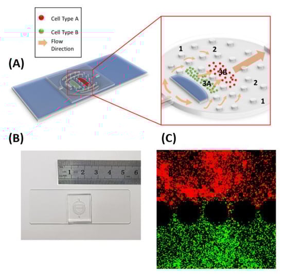 Lymph Node-on-a-chip (LN-on-a-chip). (A) Schematic showing the different regions of the device formed using micropillars. Region labelled 1 corresponds to the Subcapsular Sinus of the native LN, Region labelled 2 corresponds to the Reticular Network, Region labelled 3A corresponds to the Follicle and Region labelled 3B corresponds to the Paracortex. Regions 3A and 3B are cellular regions loaded with immune cells embedded in 3D hydrogel matrices. (B) Miniaturized LN-on-a-Chip. With respect to the previous published device, the LN-on-a-chip has been further miniaturized (2.5 times smaller) to allow efficient and high throughput experimentation and (C) two different fluorescently labelled immune cells (Raji B-red and Jurkat T-green), each in a distinct compartment within the LN-on-a-Chip.