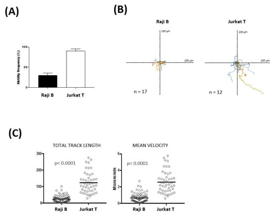 Trafficking of lymphocytes within lymphoid organs is essential for initiating contact with antigen-presenting cells []. Moreover, the ability of B and T cells to move among strategic locations in the LN is critical to achieve a fully humoral response []. Two-photon laser microscopy has allowed to characterize B and T cell movement within the LN and has shown that lymphocytes move by a random walk [,]. In order to address whether the LN-on-a-chip supports cellular motility we analyzed in real time the movement of T and B immune cells by time-lapse microscopy. Jurkat T cells and Raji B cells were embedded in the collagen gel, injected in the microfluidic flow-through device and monitored for 150 min. We found that 90% of Jurkat T cells while only 30% of Raji B cells move freely inside the biomimetic LN (Figure 3A). The rose plots showing the cellular tracks stress the characteristic random T cell motility (Figure 3B) and underlie the different motility behaviors between the two cell types. Jurkat T cells travel longer distances than Raji B cells (average track length 123.4 ± 9.4 μm for Jurkat T cells and 24.5 ± 1.9 μm for Raji B cells; Figure 3C), and move with an increased average velocity (Jurkat T cells 2.6 ± 0.2 μm/min; Raji B cells 0.66 ± 0.05 μm/min; Figure 3C). Similar speed values have been previously reported for these cells in different experimental settings [,]. These results are also consistent with previous studies showing that, in their native environment, T cells move more than B cells (motility coefficient is five to six times bigger) and explore a wider territory []. Taken together, these results show that we have established a 3-D LN model that supports immune cell movement.