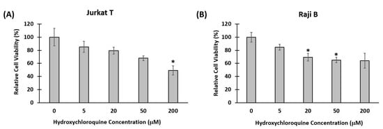 Relative viability of cells treated with hydroxychloroquine. Jurkat T and Raji B cells were incubated with different concentrations of hydroxychloroquine for 24 h and then MTT assay was performed to measure cytotoxicity. (A) Viability of Jurkat T cells. At low concentrations of the drug (5, 20, 50 μM), there was no significant difference between the viability of cells treated with HCQ and the viability of control cells. At higher concentration (200 μM), there was a significant decrease in the viability of cells treated with HCQ compared to control cells. (B) Viability of Raji B cells. At low concentrations of the drug (20, 50 μM), there was a significant decrease in the viability of cells treated with HCQ and the viability of control cells. (* p < 0.05 compared to control- no hydroxychloroquine treatment).