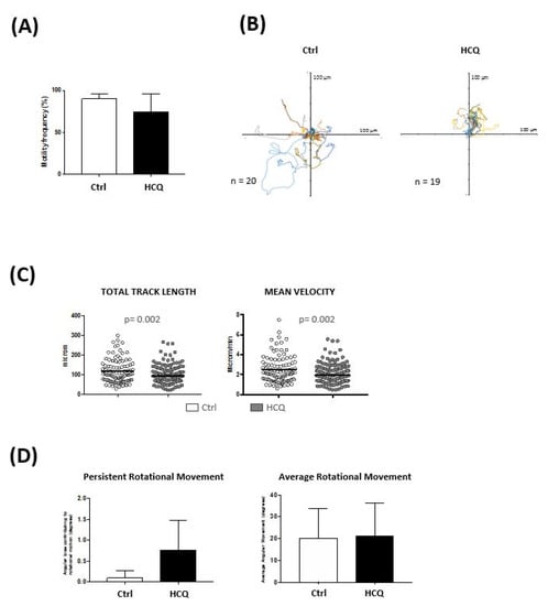 Cell motility in response to Hydroxychloroquine (HCQ). (A) Frequency of motility (B) representative individual cell tracks (C) total track length and velocity and (D) persistent rotational motion and average rotational movement per step of Jurkat T cells seeded in the LN-on-a-chip. Hydroxychloroquine was added in the culture media and administered through a continuous. After 30 min of HCQ treatment, time-lapse imaging was performed and movie recorded for 150 min. Data in panel A and D correspond to the merge of three experiments and represents mean ± standard error mean; tracks plotted in panel B correspond to one representative experiment; data in panel C represent individual cells from three pooled experiments (mean is also indicated).