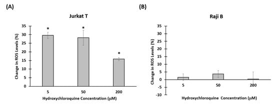 The percent change in Reactive Oxygen Species (ROS) in response to hydroxychloroquine (HCQ). (A) Percent change in Jurkat T cells. There was a significant increase in ROS levels in cells treated with HCQ compared to control cells. This increase was seen at all concentrations of the drug (* p < 0.05 compared to control- no HCQ treatment) (B) Percent change in Raji B cells. There is no significant change between ROS produced by cells treated with HCQ and that produced by control cells.