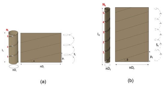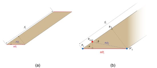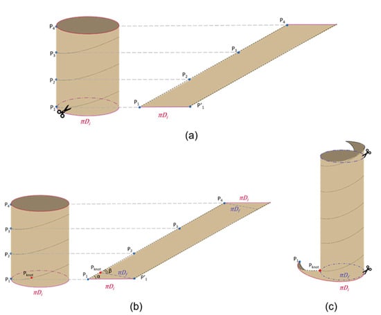 After defining the initial number of coils (), the cylinder is cut along the resulting spiral path (black dotted line in Figure 3a). Once cut, it is worth noting that, if the cylinder were completely unrolled, a parallelogram would be obtained, which base is equal to (see Figure 3a). In practice, once the cylinder is cut, it is stretched and re-wrapped with the new desired diameter ). In order to match the bowel flaps, physically, the parallelogram has to be re-wrapped with a new angle β) on the base (as shown in Figure 3b). In other words, if the parallelogram in Figure 3b is re-wrapped by matching with the original cylinder is obtained, while if the parallelogram is re-wrapped by matching with it results in the final cylinder. In this case, it is worth it to note that, at the extremities, two triangles will result in excess (as shown in Figure 3c).