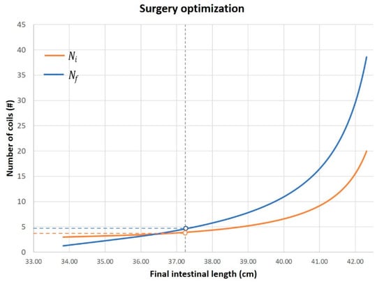 With such a mathematical framework at hand, and taking into account the described considerations on surgical feasibility, it is possible to set up the cutting angle , to achieve the longest final length, by guarantying the desired intestinal diameter and a manageable number of coils to be cut and sutured. In fact, starting from the mathematical framework, a graph that supports the surgeon in the choice of the cutting angle can be create for each clinical case. The graph is patient-specific as it is based on the patient’s anatomical data (see Figure 6).