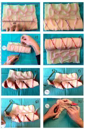 To obtain a precise cut and to execute it in a simple way, the surgeon traces the spiral path on the intestinal tract to be treated with a surgical skin marker. Specifically, starting from the extremity of the intestinal tract, points ,…, and the helicoidal path are marked, considering that the segment corresponds to the pitch of the helix i.e. (see Figure 7a,b). Then, the bowel is turned upside down to access the posterior wall, and the helical path, traced in the previous phase, is continued (Figure 7c,d). The bowel is then cut along the spiral path and perpendicular incisions are made on the mesentery to allow the subsequent stretching. Another point is marked along the spiral path on the antimesenteric flap is at a specific distance from point (see Equation (5)); this segment defines the intestinal triangle (see Figure 4b), which must be invaginated or removed. Point is moved until it matches the point on the mesenteric flap and the first knot is placed (Figure 4g), which allows the intestine to roll up with the correct angle . Finally, the flaps of the intestine are sutured following the rolling angle that comes out of the first suture point.