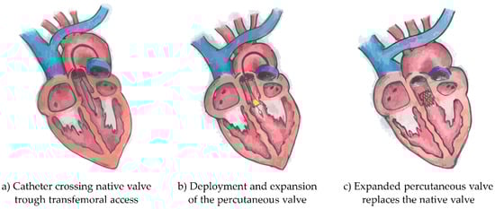 Diagrams of the three phases of transcatheter aortic valve implantation intervention. Originally the catheter crosses the native valve trough transfemoral access (a), follows the deployment and expansion of the percutaneous valve (b) and finally the expanded percutaneous valve replaces the native valve (c).