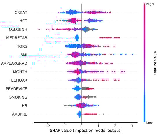 According to the results obtained with the SHapley Additive exPlanations and the related discussion of these results with the cardiologists, we identified the most relevant features for the prediction of one-year mortality for TAVI.