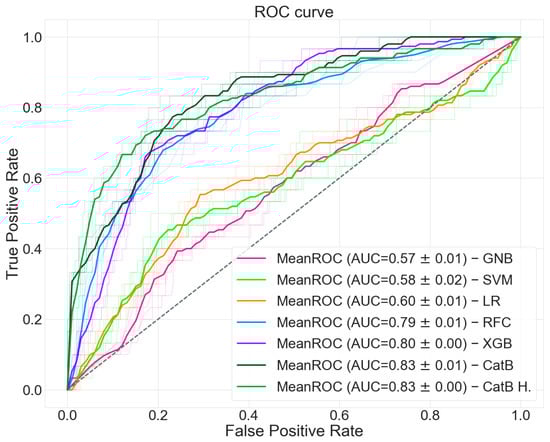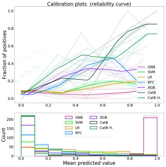 The calibration curves for each classifier are shown in Figure 6. As previously mentioned, the classifiers calibration was not been performed because the data available was not sufficient to generate a regression model to calibrate the output. Despite the uncalibrated predictions, CatBoost was shown to have, with respect to the other classifiers, a calibration curve that approaches the ideal one.