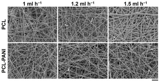 FESEM images of polycaprolactone (PCL) and PCL-polyaniline (PANI) electrospun membranes, obtained by varying the flow rate between 1 and 1.5 mL h−1 (scale bar = 10 µm, magnification = 2 K×). Arrows indicate fiber defects.