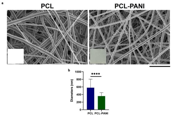 (a) FESEM images of optimized PCL and PCL-PANI electrospun membranes (scale bar = 10 µm, magnification = 5 K×). Photograph of PCL and PCL-PANI membranes are reported in the inset; (b) Comparison between PCL and PCL-PANI fiber diameters. Statistical difference (**** p < 0.0001).