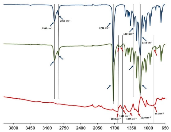 The FTIR-ATR spectra of the PCL-PANI membrane were compared with those of the PCL membrane and PANI-CSA film (Figure 3) to investigate the surface functional groups of the scaffold, obtained by the bending of materials. The PCL-PANI spectrum showed all the main PCL characteristic peaks at 2942 and 2866 cm−1, referring, respectively, to the asymmetric and symmetric stretching of CH2 groups [], at 1721 and 1162 cm−1, corresponding to the stretching of C=O [] and C–O [], and at 1294 cm−1 related to the bands of C–C and C–O of the PCL crystalline phase []. Moreover, specific PANI-CSA peaks at 1610, 1562 (stretching vibration of quinoid and benzenoid rings) [] and 881 cm−1 (N–H bending of amine peak) [] were also detected on the surface of PANI electrospun membranes.
