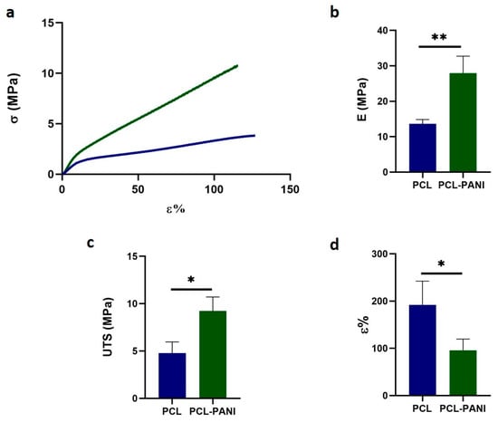 Mechanical properties of PCL and PCL-PANI electrospun mats: (a) stress-strain curves; (b) Young’s modulus (E); (c) ultimate tensile strength (UTS) and (d) strain at failure (ε). Statistical difference (* p < 0.05; ** p < 0.005).