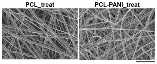 FESEM micrograph of PCL and PCL-PANI after Ar cold atmospheric plasma treatment (scale bar = 10 µm, magnification = 5 K×). No alterations in fiber morphology were detected after plasma treatment compared to untreated samples.