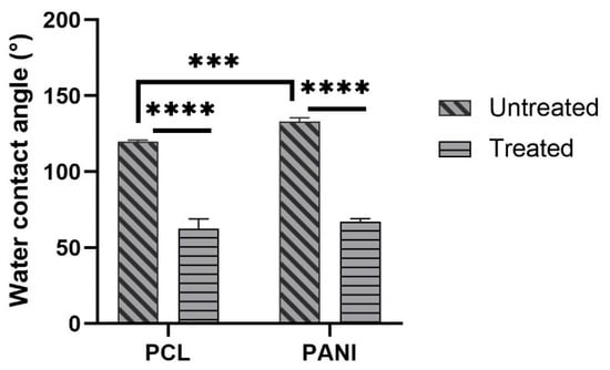 The decrease in the water contact angle for treated PCL and PCL-PANI to 62.7° ± 6.3° and 67.1° ± 2° demonstrated the effective modification of the surface after plasma treatment.