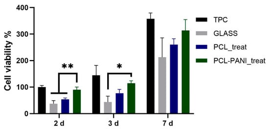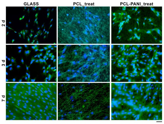 The influence of PANI on the viability of HFF-1 fibroblasts was assessed with the resazurin assay. The viability of cells on TCP at 2 days was used as a control. As shown in Figure 8, the metabolic activity of the seeded cells on all the substrates was significantly increased during the culture period. A higher level of viable cells was detected for PCL-PANI_treat on day 2 and 3 compared to glass coverslip (GLASS)and PCL_treat, indicating that the blended scaffold better promotes attachment and growth of the cells. Moreover, cell viability for seeding at 7 days, was comparable for all the scaffolds, as well as for the control.