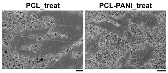 Since an improvement in surface wettability leads to a greater interaction between water and the membrane, in vitro biodegradation of PCL_treated and PCL-PANI_treated was assessed through FESEM by measuring the diameter of 100 fibers per sample. As shown in Figure S5, the stability of treated mats in the physiological environment (PBS solution at 37 °C) was confirmed up to 7 days. Moreover, no significative variation in the PCL_treat and PCL-PANI_treat sample diameters (Table S2) was recorded.