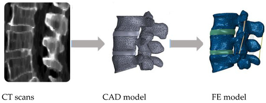 Figure 1 shows a common patient-specific pathway for 3D model reconstruction from imaging examinations (CT scans), considering the design of the IVD on a given computer aided design (CAD) software and then the inclusion of the ligaments within the FE modelling software.