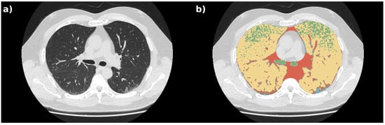 According to the permission of the ethics committee and the chosen license (CC BY-NC 4.0), scientific usage of the dataset is encouraged, while any commercial use is forbidden. Each CT is made of about a hundred of slices, so manual labeling is practically unfeasible. In addition to the aspect of time consumption, it is very difficult for a radiologist to assign a well-defined tissue class to each lung voxel. For these reasons, relying on the assumption that different tissue classes have different densities, a machine learning approach was chosen to cluster voxels based on the probability of being part of a certain class. As a consequence, shape, anatomical, and spatial information was not included in the process. While this strategy allows one to classify tissues without a priori information (such as manual contours), in some cases, some voxels can be erroneously labeled. Additional errors could caused by the intensity threshold segmentation and the series of morphological filters used to identify the lung tissues. Although this is a key step for a completely automatic workflow, occasionally, it can include some non-lung tissues (e.g., portions of the heart and/or vertebrae) and/or exclude some portions of the volume of interest (such as part of the fibrous stripes close to the lung wall). In order to mitigate this problem, a class named “non-lung tissue” was added to the classification process.
