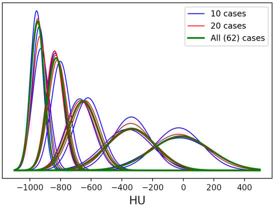 The robustness of the unsupervised labeling method was assessed by randomly subsampling the dataset in a series of folds of increasing size; in particular, we started from a fold of size 10 with steps of 10. In order to take noise and random effects into account, we randomly extracted three different groups for each fold size. The stopping criterion was the “convergence” of GMM parameters, i.e., stability. One can observe that the distribution already tends to overlap among different groups with a size of 20, as shown in