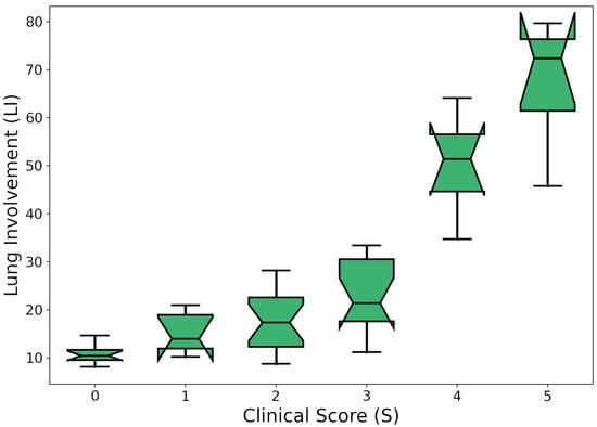 The coefficient of determination () was estimated to assess the proportion of the variance in the dependent variable (scores) that is predictable from the independent variable (CT coefficients). It is worth noting that the considered dataset is highly unbalanced with respect to S = 2 and S = 3. This is expected for two reasons: (1) Most of the patients arrived at the hospital with pneumonia symptoms, but very few were critical; (2) uncertain evaluations are likely to fall into the central categories. In order to take the problem into account, an iterative resampling strategy was carried out. In particular, for n = 100 iterations, R and were computed by fitting a linear regression model, drawing a proportional number of samples from each group in the original population. Mean ± standard deviation values for and C were and , respectively. As a result, the clinical score was found to strongly correlate with the presence of GGOs and consolidations predicted by the GMM.