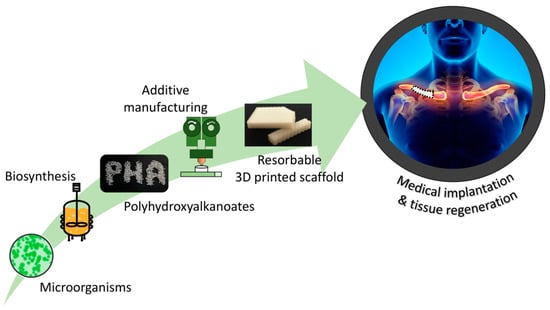 In this review, the PHA family is taken into consideration, and particular interest is reserved to its application in the biomedical field. Since the beginning of the twenty-first century, an increasing number of scientific studies and clinical trials have been published about PHA medical devices for different final applications, such as tissue engineering, drug delivery, or as vascular stents []. Therefore, first this review is aimed to present and discuss the results obtained with PHA and traditional techniques, like solvent casting, phase separation, salt leaching, or electrospinning. Furthermore, a great importance is given to the introduction of additive manufacturing in this research field, and particularly to the innovations and advantages introduced by 3D printing, which allowed us to overcome some of the greatest limitations of traditional approaches. For example, thanks to additive manufacturing, it was possible to obtain a finer control over the porosity, a true development of the devices in all three dimensions, and even the reproduction of complex structures, which are able to mimic natural tissues and which are highly tailored to the physical requirements of each patient [,]. Finally, this review is concluded with a discussion, in the authors’ opinion, of the most likely future biomedical perspectives for this promising class of biopolymer, and of the new targets that can be achieved, thanks to 3D printing, in a new way of considering medicine, with a high customization of medical care. In Figure 1 shows a schematic representation of the overall topic and structure of this review work.