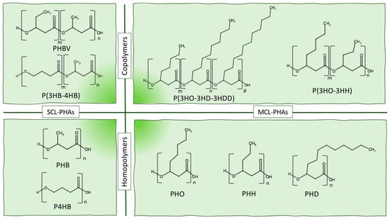 PHAs classification depending on the chain length and the chemical structure of the monomers. PHBV—poly(3-hydroxybutyrate-co-3-hydroxyvalerate); P(3HB-4HB)—poly(3-hydroxybutyrate-co-4-hydroxybutyrate); PHB—poly(3-hydroxybutyrate); P4HB—poly(4-hydroxybutyrate); P(3HO-3HD-3HDD)—poly(3-hydroxyoctanoate-co-3-hydroxydecanoate-co-3-hydroxydodecanoate); P(3HO-3HH)—poly(3-hydroxyoctanoate-co-3-hydroxyhexanoate); PHO—poly(3-hydroxyoctanoate); PHH—poly(3-hydroxyhexanoate); PHD—poly(3-hydroxydecanoate).