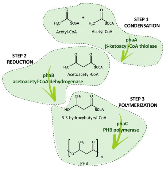 The biosynthetic pathway of PHB consists of three enzymatic reactions catalyzed by three different enzymes: phbA, phbB, and phbC. The first reaction is a condensation of two acetyl coenzyme A (acetyl-CoA) molecules into acetoacetyl-CoA by β-ketoacyl-CoA thiolase (encoded by phbA). The second reaction is the reduction of acetoacetyl-CoA to (R)-3-hydroxybutyryl-CoA by an NADPH-dependent acetoacetyl-CoA dehydrogenase (encoded by phbB). Lastly, the (R)-3-hydroxybutyryl-CoA monomers are polymerized into PHB by PHB polymerase (encoded by phbC) [,]. The scheme in Figure 5 synthesizes the fundamental enzymatic biosynthetic pathway.