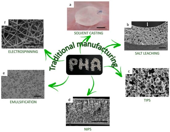 Advances in the biomedical field are not limited to their final applications or the materials used, but they may also concern advancements in the processing techniques of the final implants and devices. Considering the thermoplastic behavior and the solubility in organic solvents of PHA, different approaches have been followed for transforming PHA raw material into architectures with various potential biomedical applications. The first PHA biomedical devices were simple systems with no control on the structure development, and they were obtained by traditional methods, such as (1) solvent casting, (2) salt leaching, (3) thermally induced phase separation (TIPS), (4) non-solvent-induced phase separation (NIPS), (5) emulsification, and (6) electrospinning. Here, the main features of these techniques are reported and summarized.