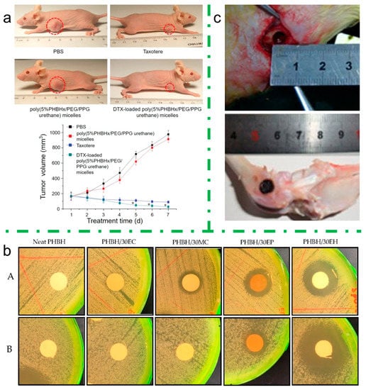 Experimental PHA drug release applications. Panel (a) shows in vivo investigation of mice melanoma treatment with PHBH-based polymer micelles loaded with docetaxel (DTX-loaded poly(5%PHBHx/PEG/PPG urethane) and different control groups: Phosphate Buffered Saline (PBS), a commercial docetaxel treatment (Taxotere), and unloaded PHBH-based polymer micelles (poly(5%PHBHx/PEG/PPG urethane). Visual appearance of subcutaneous tumor sizes and tumor volume measurements, within treatment time, are displayed at the top and bottom of the panel, respectively (adapted from Reference []). Panel (b) represents the inhibition zones of neat PHBH and PHBH composite electrospun nanofibers with centella (30EC) and (30MC), propolis (30EP), and hinokitiol (30EH) on Gram-positive bacteria (S. aureus) (A) and Gram-negative bacteria (E. coli) (B) (adapted from Reference []). Panel (c) shows two photographs of a cylindrical scaffold (D × H = 6 × 8 mm2) 3D printed via DIW and implanted in a rabbit’s femur for post-surgical treatment of osteoarticular tuberculosis (adapted from Reference []).