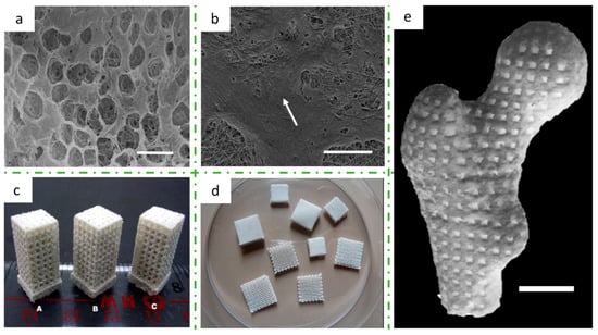 Li et al. and Zu et al. suggested an interesting application for a mesoporous bioactive glass (MBG) and PHBV composite, 3D printed via DIW starting from a polymer ink dissolved in chloroform and dimethyl sulfoxide. The final goal of this application is meant for post-surgical treatment of osteoarticular tuberculosis, and specifically the 3D-printed scaffolds can be implanted in the surgical defect, combining the osseous regeneration effect with the release of an antituberculotic drug, such as isoniazid or rifampin. The studies investigated in vitro drug release and cellular proliferation, and in vivo surgical procedure was run, implanting the 3D-printed cylindrical scaffolds (D × H = 6 × 8 mm2) into the femur of different rabbits, represented in Figure 8c. Besides the osteogenetic feature of this material, another attractive property is the slower and controlled release of antituberculotic drug, up to three months, lengthening the healing period and reducing systemic side effects [,].