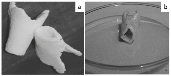 The former studies were fundamental to characterize and to state the possible use of this class of polyester for vascular engineering applications. However, there was a big technological issue with this traditional technique, because solvent casting is not suitable for the production of final devices with complex and 3D structures, which are meant to be implanted in human blood vessels. Gao et al. suggested the use of electrospinning to fabricate two kinds of PHBH vascular grafts, including straight and corrugated structures with 6 mm inner diameters. These devices have been tested mechanically, to undergo radial compression and circumferential tensile stresses, as well as for suture retention strength and radial compliance. Moreover, the biocompatibility was evaluated in vitro with hemolytic and cytotoxicity tests. The results obtained in this study demonstrated good application value in the field of stent vessel engineering, even comparing the final properties of the experimental grafts with those of commercial ones []. Electrospinning is a well-known technique for production of microporous films, but the production of devices with an actual 3D structure is time-consuming. For example, in this study, the realization time of a vascular graft with a thickness of 200 μm took 6 h. Figure 9a shows the final macroscopic aspect of such electrospun PHBH vascular grafts.