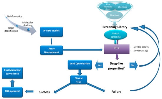 Druggable targets are scanned either virtually utilizing virtual compound structure libraries and/or by cell-based or biochemical testing of available peptide or chemical libraries via high-throughput screening (HTS). Abbreviations: Food and Drug Administration (FDA).