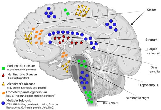 Schematic summary of the regions of the brain affected by major neurodegenerative diseases (NDDs) and the misfolded proteins that are involved in their pathology. Adapted from [,].