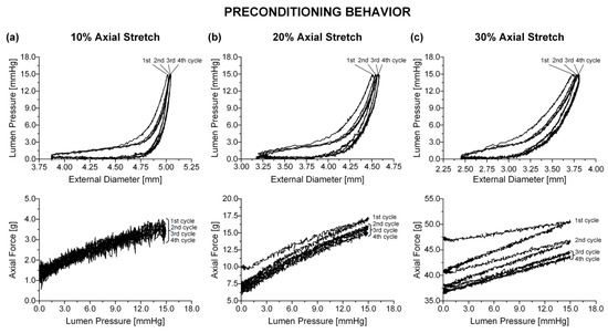 Online record of preconditioning for a distal duodenal specimen at (a) 1.1, (b) 1.2, and (c) 1.3. The 2nd, 3rd, and 4th pressure-diameter cycles overlapped and were enveloped by the larger 1st cycle. Τhe area enclosed by the 1st and 2nd force-pressure cycles increased with increasing , with all cycles overlapping at 1.1 and the 3rd and 4th cycles being very slim and nearly overlapping at 1.2 and 1.3.