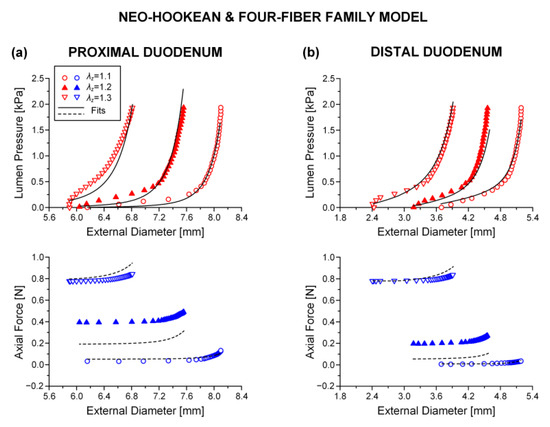 Plot of measured lumen pressure (red color) and axial force (blue color) vs. external diameter data at three different fixed axial stretches {1.1, 1.2, 1.3} for a characteristic specimen from the proximal and distal duodenum and fits (solid lines for lumen pressure and dashed lines for axial force) calculated using the neo-Hookean and four-fiber family microstructure-based model of Equation (1) with the following best-fit model parameters for the (a) proximal duodenum: 3.7 × 10−11 kPa, 0.312 kPa, 16.078, = 8.467 kPa, = 3.143, = 9.5 × 10−9 kPa, = 3.922, = 0.670 rad, ε = 0.321, 0.870, 4.7 × 10−5 and (b) distal duodenum: 5.0 × 10−6 kPa, 0.336 kPa, 6.940, = 2.470 kPa, = 7.840, = 0.127 kPa, = 3.4 × 10−8, = 0.308 rad, ε = 0.322, 0.881, 6.3 × 10−6. Data are shown every 0.5 mmHg for clarity.