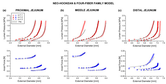 Best-fit parameters of the neo-Hookean and four-fiber family model were found from the pressure-diameter-force data for each small intestinal specimen using the Nelder–Mead algorithm. The nonlinear regression for the parameter estimation reached convergence for all the specimens studied, and the estimated parameters were indeed best fits based on global minimization of RSS. Average values of the model parameters for the eight small intestinal segments are listed in Table 1, while individual parameter values are listed in Tables S1–S3 of the Supplementary Materials. Representative examples of fits from each segment are shown in Figure 2, Figure 3 and Figure 4. Good correspondence between the model and data was evidenced on all occasions for the three jejunal segments (Figure 3) and proximal ileum (Figure 4a). Note in Table 1 the high values of the determination coefficient, R2~0.90, and the low values of root-mean-square error, ε~0.26, for these segments. The correspondence between the model and data for the remaining segments was less good (R2~0.87 and ε~0.32), due to the inadequate fit to the force data of the 1.2 axial stretch in five out of the twelve examined duodenal specimens (Figure 2a,b), the inadequate fit to the force data of the 1.1 and 1.3 axial stretches in two out of the six middle ileal specimens (Figure 4b), and the inadequate fit to the pressure data of the 1.1 and/or 1.3 axial stretches in two out of the six distal ileal specimens (Figure 4c).