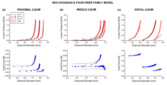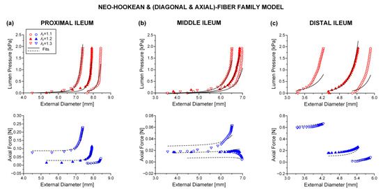 As Figure 4 but using the neo-Hookean and (diagonal and axial)-fiber family model with the following best-fit model parameters for the (a) proximal ileum: 0.102 kPa, 0.006 kPa, 6.310, = 1.965 kPa, = 2.102, = 0.513 rad, ε = 0.260, 0.905, 4.8 × 10−4, (b) middle ileum: 3.2 × 10−11 kPa, 0.694 kPa, 4.890, = 3.722 kPa, = 7.5 × 10−11, = 0.852 rad, ε = 0.380, 0.788, 0.002, and (c) distal ileum: 6.3 × 10−14 kPa, 3.281 kPa, 29.283, = 7.588 kPa, = 4.554, = 0.678 rad, ε = 0.378, 0.825, 0.016. Data are shown every 0.5 mmHg for clarity.