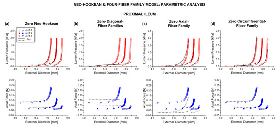 Shown in Table 2 are the results of successively zeroing each one of the model terms for pooled data from the two duodenal, three jejunal, and three ileal segments; see also Figure 5, illustrating the best fits to characteristic pressure-diameter-force data for the proximal ileum. Upon visual inspection of the graphs and given the and values in Table 2 resulting from nonlinear regression, it was determined that zeroing the neo-Hookean or circumferential-fiber family terms caused very little change in the goodness of fit; cf. Figure 5a,d with Figure 4a. In stark contrast, note the substantial deterioration of the goodness of fit in the absence of the remaining model terms. The pressure-diameter data were ill-fitted when zeroing the diagonal-fiber family term (Figure 5b), and the force-diameter data were ill-fitted when zeroing the axial-fiber family term (Figure 5c). When both the axial- and circumferential-fiber family terms were zeroed (Table S7 and Figures S1–S3 of the Supplementary Materials), the pressure-diameter data were less accurately fitted in comparison to the neo-Hookean and four-fiber family model, but the force-diameter data were severely underestimated throughout the entire range; cf. Figure S3a with Figure 4a. This neo-Hookean and diagonal-fiber family model was never over-parameterized; refer to the > 10−4 values in Table S7. Still, the computed root-mean-square error and determination coefficient values of ~0.5 and ~0.5 were indicative of greatly diminished goodness of fit compared to the comprehensive model and the variants without the neo-Hookean or circumferential-fiber family term.