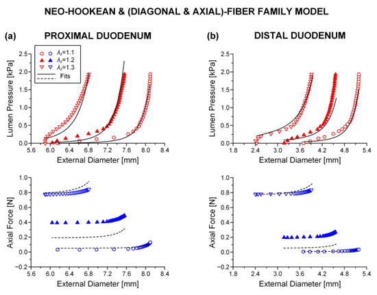 As Figure 2 but using the neo-Hookean and (diagonal and axial)-fiber family model with the following best-fit model parameters for the (a) proximal duodenum: 3.7 × 10−11 kPa, 0.312 kPa, 16.078, = 8.467 kPa, = 3.143, = 0.670 rad, ε = 0.321, 0.870, 0.018 and (b) distal duodenum: 3.1 × 10−6 kPa, 0.707 kPa, 5.332, = 0.915 kPa, = 9.892, = 0.319 rad, ε = 0.375, 0.838, 3.7 × 10−5. Data are shown every 0.5 mmHg for clarity.