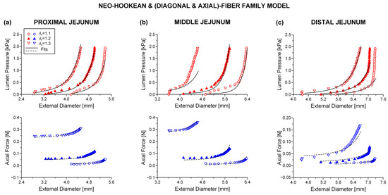 As Figure 3 but using the neo-Hookean and (diagonal and axial)-fiber family model with the following best-fit model parameters for the (a) proximal jejunum: 7.0 × 10−12 kPa, 3.121 kPa, 9.743, = 25.331 kPa, = 3.590, = 0.691 rad, ε = 0.239, 0.927, 0.020, (b) middle jejunum: 1.1 × 10−13 kPa, 0.175 kPa, 7.071, = 2.920 kPa, = 4.464, = 0.319 rad, ε = 0.353, 0.835, 9.6 × 10−4, and (c) distal jejunum: 4.7 × 10−12 kPa, 1.237 kPa, 5.379, = 1.264 kPa, = 0.944, = 0.692 rad, ε = 0.342, 0.824, 0.011. Data are shown every 0.5 mmHg for clarity.