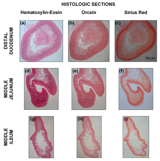 Representative adjacent transverse histologic sections for the (a–c) distal duodenum, (d–f) middle jejunum, and (g–i) middle ileum, stained with hematoxylin-eosin, orcein, and Sirius red for the identification of cells, elastin, and collagen, respectively. The scale bar applies to all the images.