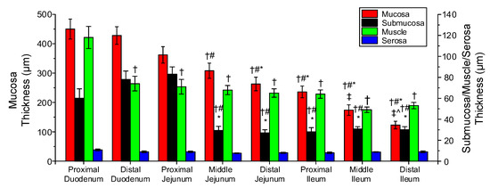 Thickness of the mucosa, submucosa, muscle, and serosa in the small intestinal segments. Symbols †, #, *, ‡, and ^ denote significant difference vs. proximal duodenum, distal duodenum, proximal jejunum, middle jejunum, and distal jejunum.