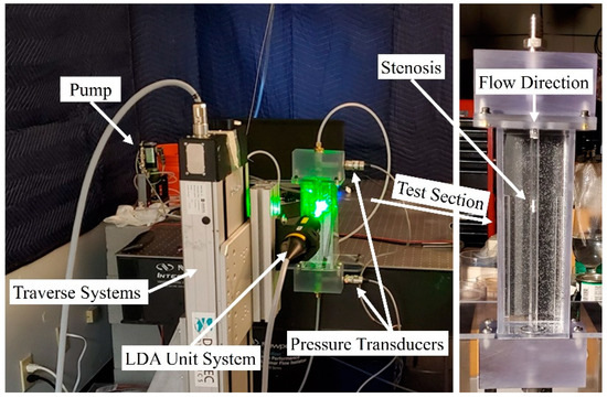 In the current study, Laser Doppler Anemometry (LDA), as a nonintrusive method that does not interfere with the flow field and sound generation, was used to measure the velocity at different locations in the upstream and post-stenotic regions to validate numerical results. Figure 2 displays the experimental setup for a constricted pipe (a simplified model of a stenosed artery). The velocity measurements using an LDA system (Dantec Dynamics A/S., Skovulunde, Denmark) were performed for 30 s at each location with sampling frequencies of more than 1000 Hz.