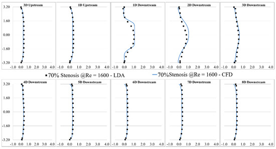 Validation of the computational results of 70% stenosis at Re = 1600 compared with the LDA measurements.