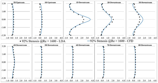 Validation of the CFD results of 92% stenosis at Re = 1600 compared with the LDA measurements.